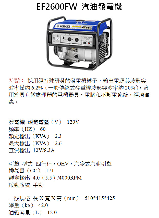 山葉EF2600D發電機  山葉EF2600FW 汽油發電機  山葉EF6600汽油引擎發電機